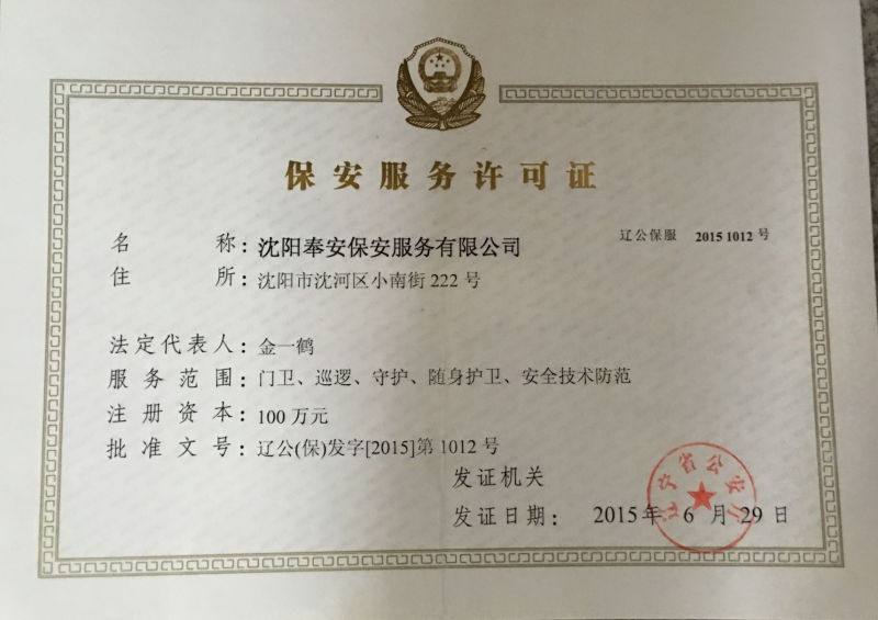 沈陽奉安保安服務(wù)有限公司(原沈陽市沈河區(qū)保安服務(wù)公司)創(chuàng)建于一九八八年八月,是遼寧省公安廳、沈陽市公安局批準(zhǔn),工商行政部門登記注冊(cè),全市首家具備保安資質(zhì)的特殊性服務(wù)企業(yè),隸屬于沈陽市沈河區(qū)政府直管的全民國有企業(yè),現(xiàn)為中國保安協(xié)會(huì)會(huì)員單位和省保協(xié)、市保協(xié)常務(wù)理事單位:在全市同行業(yè)中率先通過ISO國際質(zhì)量認(rèn)證,是市工商局批準(zhǔn)的“重合同守信用”免檢單位和沈陽市政府采購中心保安服務(wù)項(xiàng)目重點(diǎn)競標(biāo)單位;擁有一支專業(yè)化、標(biāo)準(zhǔn)化、職業(yè)化的高素質(zhì)保安隊(duì)伍,是公安機(jī)關(guān)重要的輔警力量。